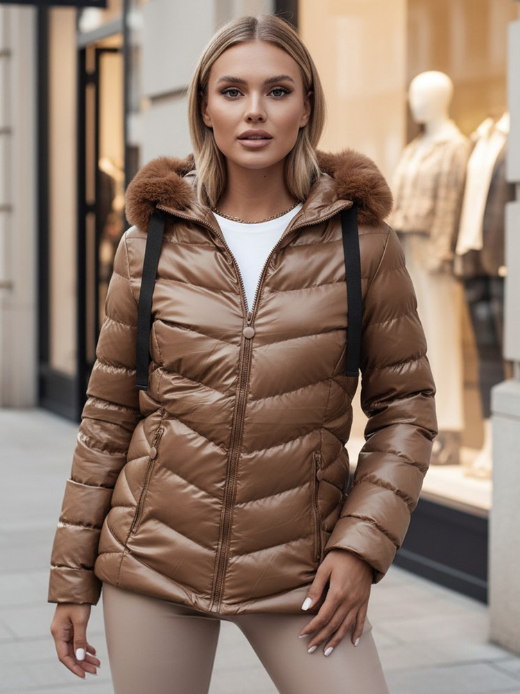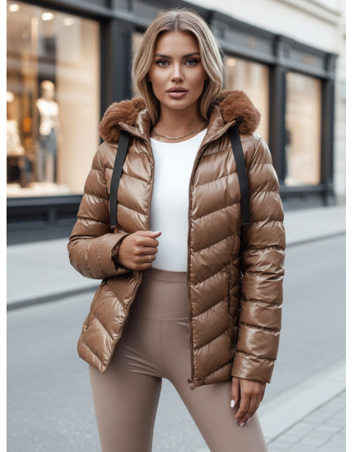 Pikowana kurtka z kapturem z połyskującego materiału, która wyróżni Cię z tłumu. Model jest taliowany, dzięki czemu pięknie podkreśla kobiece kształty. Kurtka posiada nieodpinany kaptur oraz odpinane futerko, dzięki czemu możemy z niej zrobić bardziej sportową lub elegancką wersję. Dostępna w kilku wersjach kolorystycznych.