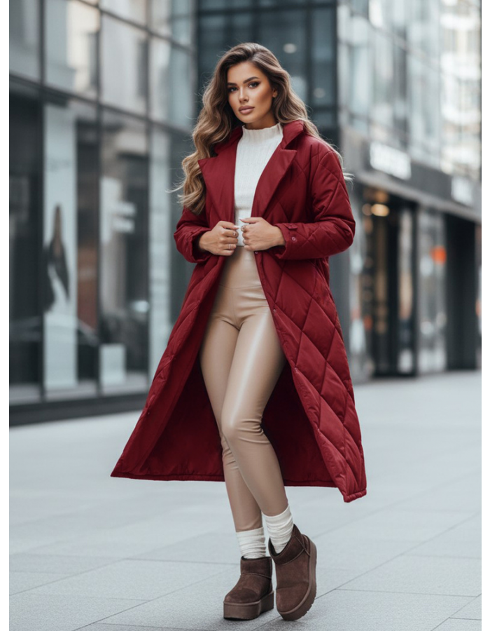Pikowana kurtka zimowa o długości midi, zapinana na napy, z wysokim kołnierzem i ocieplanym wnętrzem. Stylowy krój w romby nadaje jej modny, kobiecy wygląd, a klasyczny fason świetnie sprawdza się zarówno w miejskich, jak i codziennych stylizacjach. Kurtka zimowa idealna na chłodne dni – gwarantuje komfort, ciepło i modny wygląd przez cały sezon.