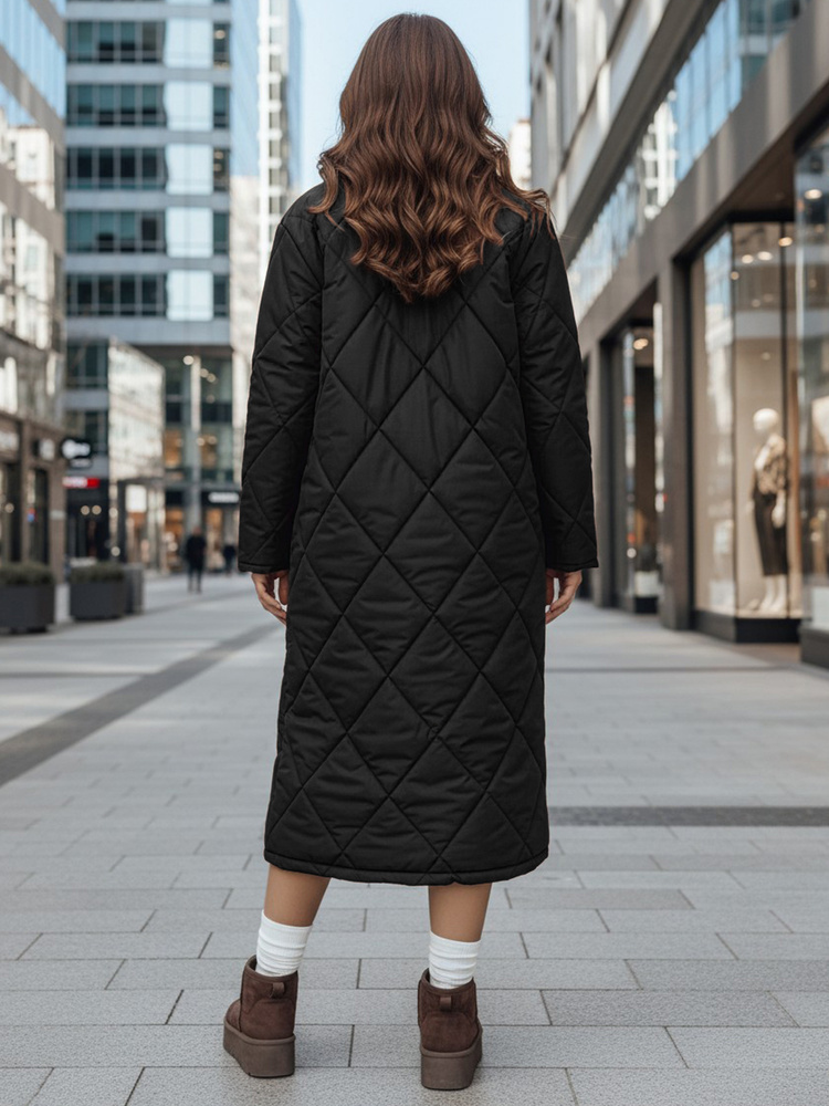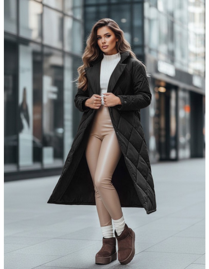 Pikowana kurtka zimowa o długości midi, zapinana na napy, z wysokim kołnierzem i ocieplanym wnętrzem. Stylowy krój w romby nadaje jej modny, kobiecy wygląd, a klasyczny fason świetnie sprawdza się zarówno w miejskich, jak i codziennych stylizacjach. Kurtka zimowa idealna na chłodne dni – gwarantuje komfort, ciepło i modny wygląd przez cały sezon.