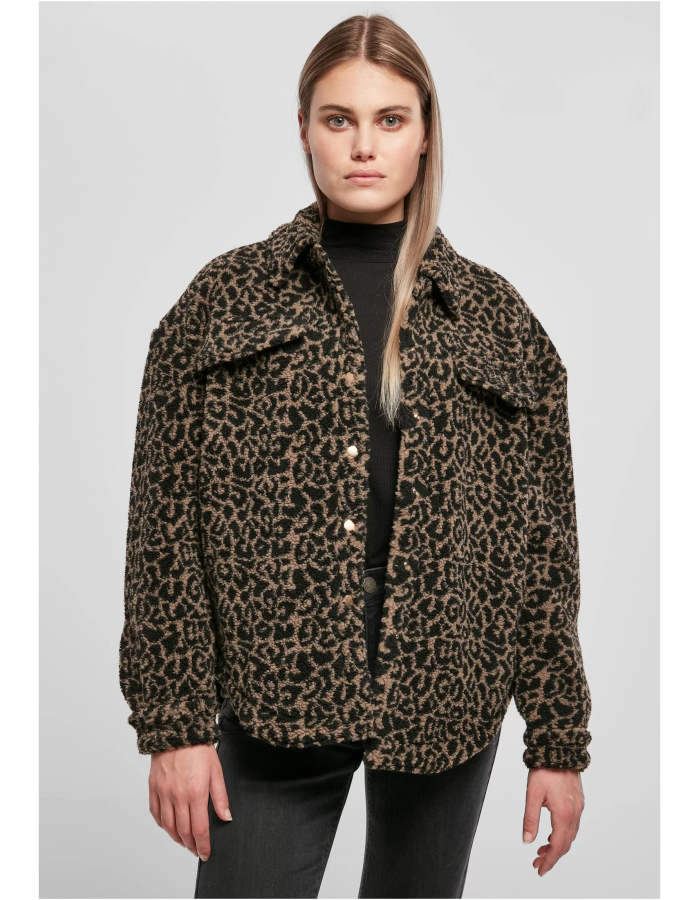 Tato dámská košile uspokojí více než jedním způsobem. Za prvé je vyrobena z plyšového materiálu Sherpa, za druhé se vyznačuje drzým celoplošným vzorem. Klasické prvky jako límeček, knoflíková léga a zaoblený lem doplňují design a jsou doplněny mírně prodlouženými zády. Dále je dámský top podšitý taftem a nabízí bokový oversize střih.