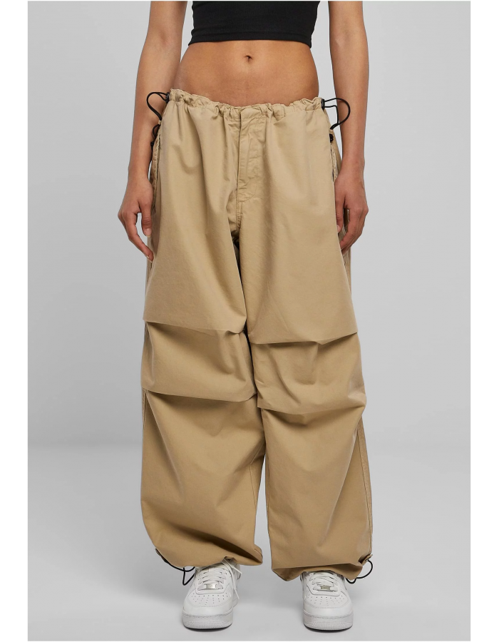 Dámský padák má vše, co si člověk může přát: stahovací šňůrky v pase a manžetách se zarážkou, vroubkovanou kolenní část i boční kapsy a našitou kapsu s klopou vzadu. Přirozeně, padákové kalhoty jsou navrženy nadměrně a sestávají z robustní plátěné bavlny.