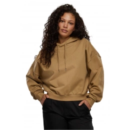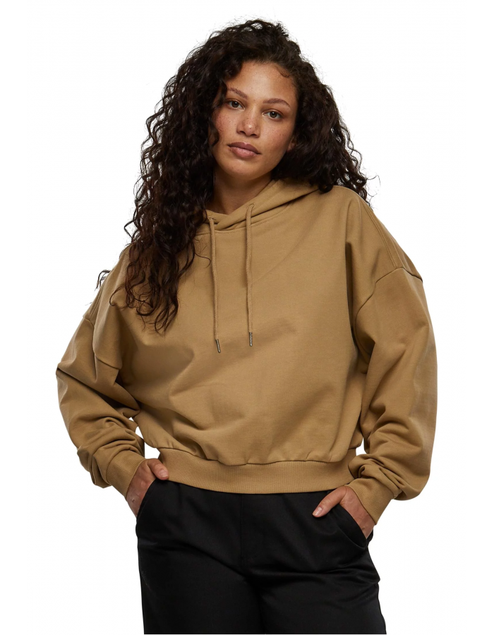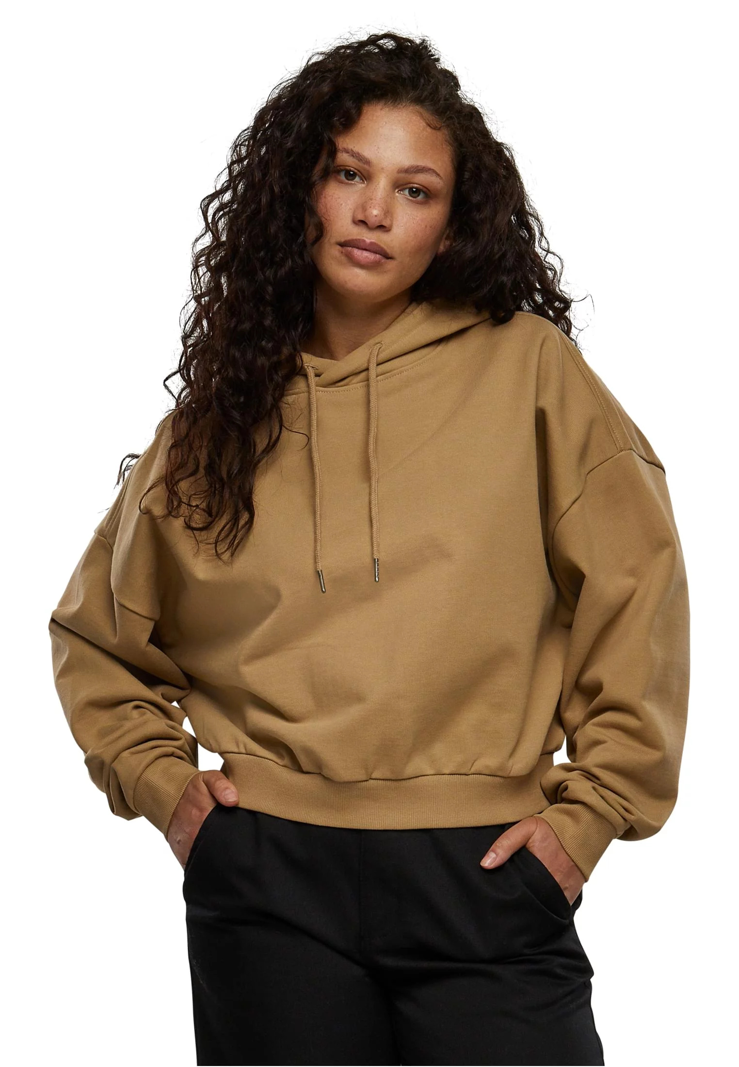 Dámská mikina s kapucí vzrušuje zkráceným střihem a obzvláště silnou froté bavlnou o gramáži 460 g/m2. Její styl uchopení završuje velká kapuce se stahovacími šňůrkami a odpovídající oversize střih se spadlými rameny. Široké žebrované manžety na rukávech a lemu poskytují dodatečné pohodlí.
