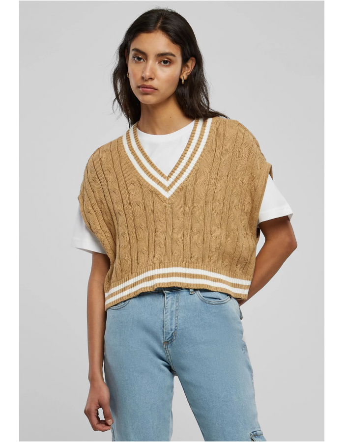 Tato superkrátká dámská pletená svetrová vesta je povedeným módním kouskem. Jeho široké, pruhované žebrované manžety na lemu a výstřih do V vytvářejí výrazné akcenty a připomínají slavný vysokoškolský styl. Zvolený vzor kabelového úpletu je pěkným kontrastem k celkovému designu. Ženský, ležérní styl je zakončen jemným žebrovaným zakončením u průramku. Dámská vysokoškolská svetrová vesta je vyrobena z bavlny a má ležérní oversize střih.