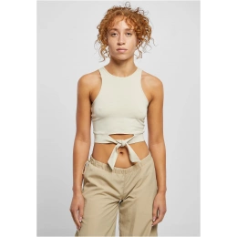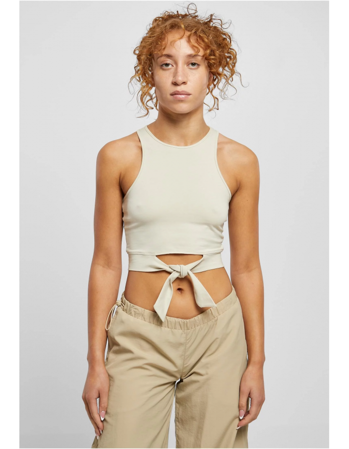 Vzhled sportovního, zkráceného dámského topu naznačuje jeho autentický styl. Nabízí dynamický racerback se spoustou volnosti vzadu a vepředu, stejně jako posádkový krk. Hravými detaily jsou dvě stuhy, které se spojují do uzlu nad pupíkem. Jednobarevný dámský top je vyroben z hladké bavlny a mírného strečového materiálu. Střih je přiléhavého slim fit střihu.