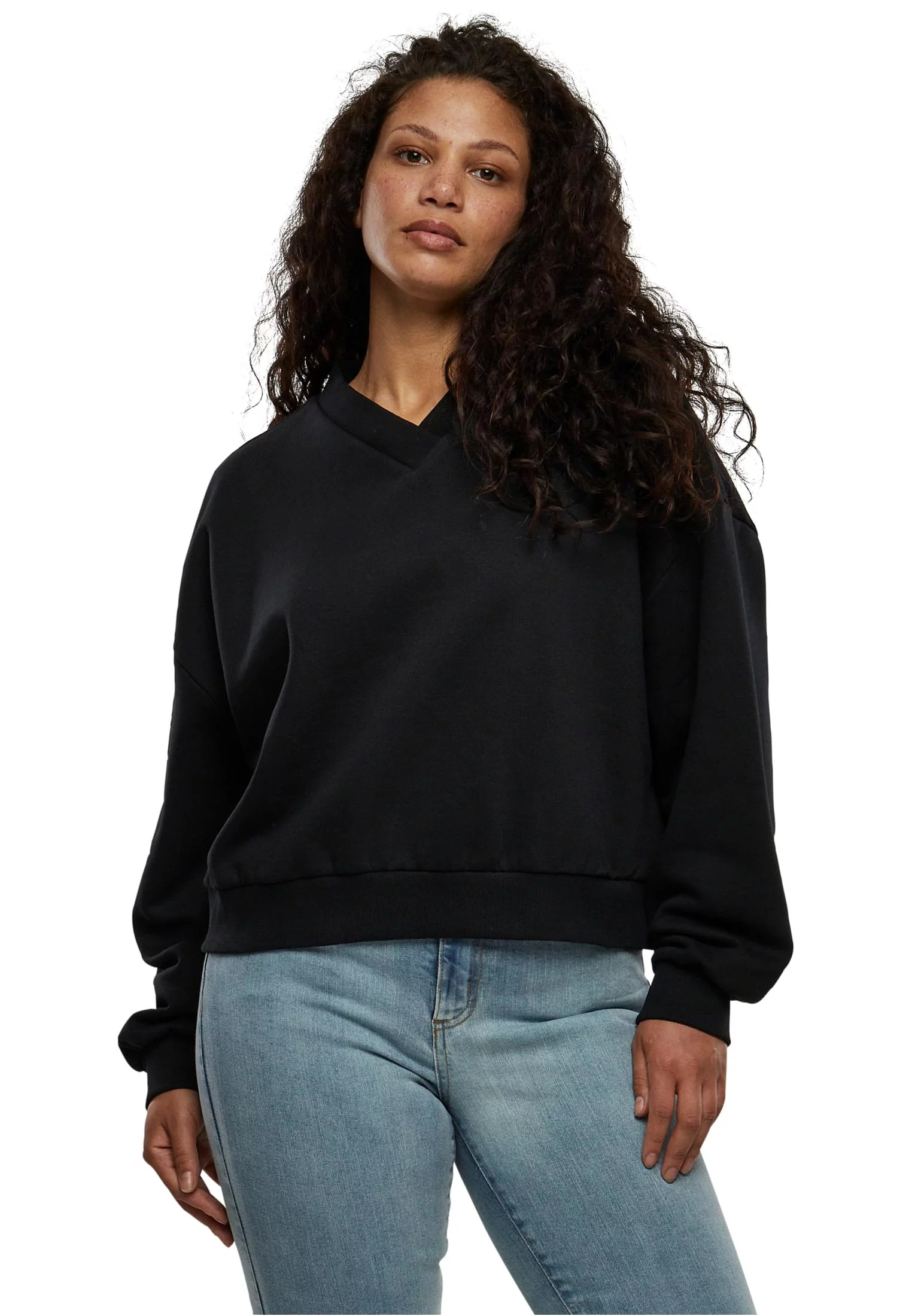 Dámský svetr představuje výstřih do V v kombinaci s zkráceným střihem. Sportovní akcenty dodávají široké žebrované manžety na rukávech a lemu. Vzhled završuje ležérní oversize střih s velkoryse spadlými rameny. Také hladká česaná fleecová tkanina poskytuje nejlepší pohodlí při nošení.