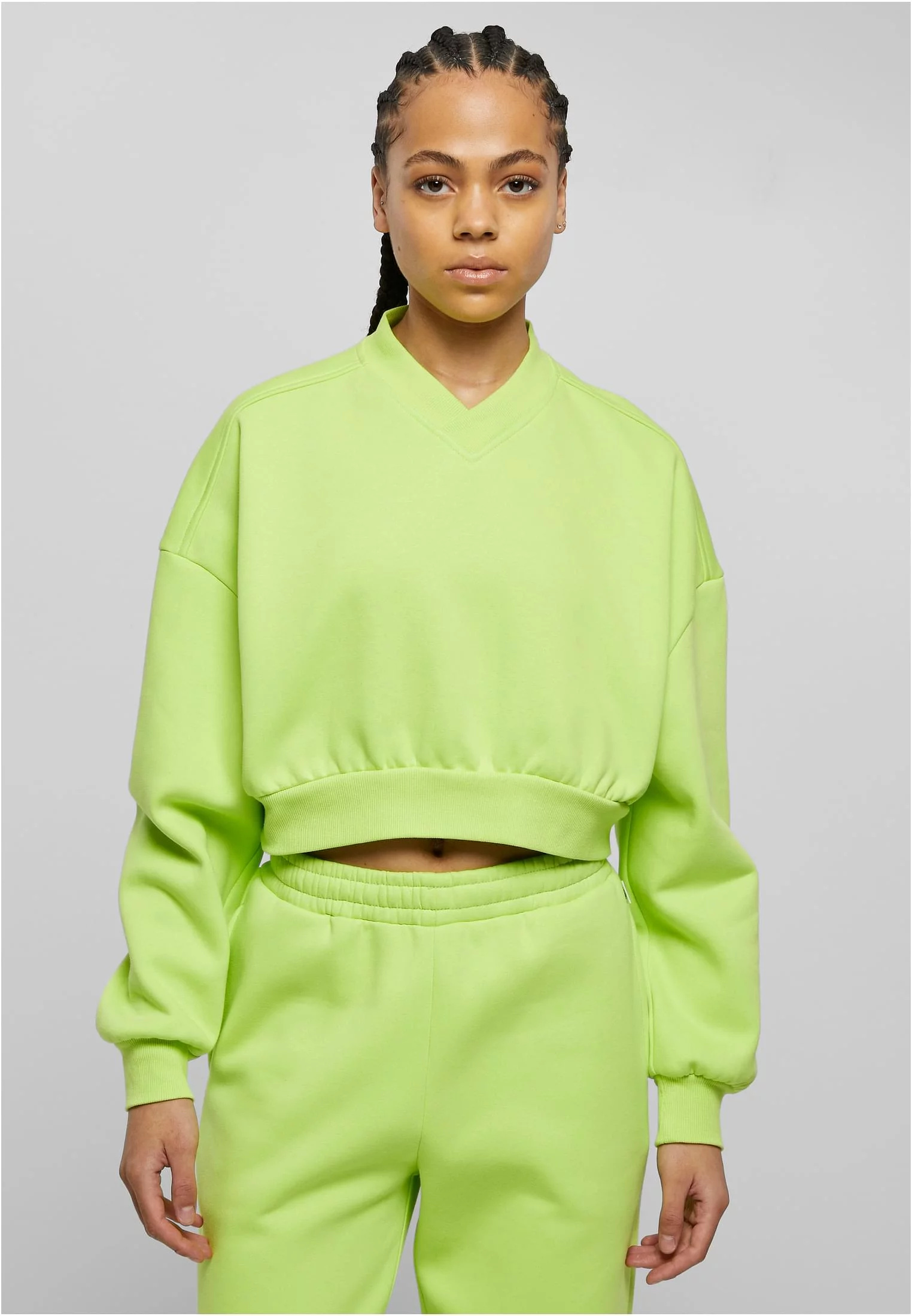 Dámský svetr představuje výstřih do V v kombinaci s zkráceným střihem. Sportovní akcenty dodávají široké žebrované manžety na rukávech a lemu. Vzhled završuje ležérní oversize střih s velkoryse spadlými rameny. Také hladká česaná fleecová tkanina poskytuje nejlepší pohodlí při nošení.