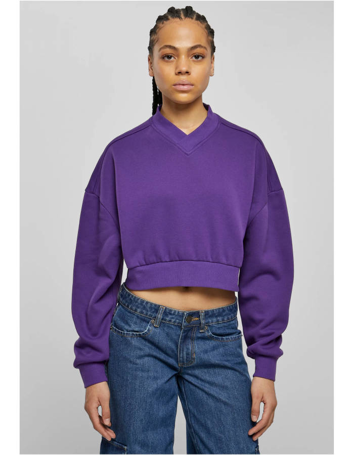 Dámský svetr představuje výstřih do V v kombinaci s zkráceným střihem. Sportovní akcenty dodávají široké žebrované manžety na rukávech a lemu. Vzhled završuje ležérní oversize střih s velkoryse spadlými rameny. Také hladká česaná fleecová tkanina poskytuje nejlepší pohodlí při nošení.