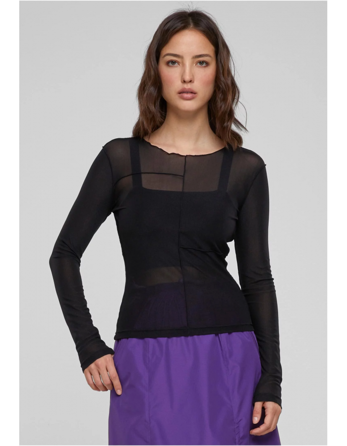 Tento dámský top s dlouhým rukávem díky své průhledné síťovině upoutá pozornost par excellence. Její kulatý výstřih je orámován filigránovým rolovaným lemem. Vnější švy jsou dalším stylovým vrcholem topu. Úzký střih a vyhrnuté lemy a manžety dotvářejí vzhled. Dámský síťovaný dlouhý rukáv je vyroben z polyamidu s elastanem a nabízí optimální pohodlí při nošení.