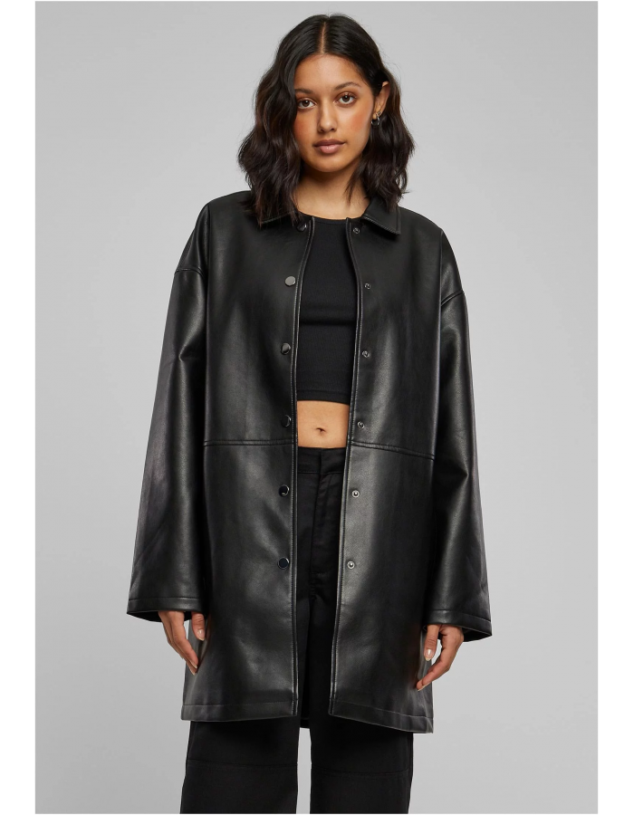 Díky skvělému designu tento dámský kabát z umělé kůže jistě poznáte. Má límeček, dlouhou knoflíkovou légu s kovovými druky a dělicí šev v pase, který poskytuje další strukturu. Městský vzhled vychází z oversize střihu se spadlými rameny. Dámský kabát samozřejmě nabízí i boční kapsy. Je vyrobena z polyesteru a bavlny a podšitá hladkým taftem.