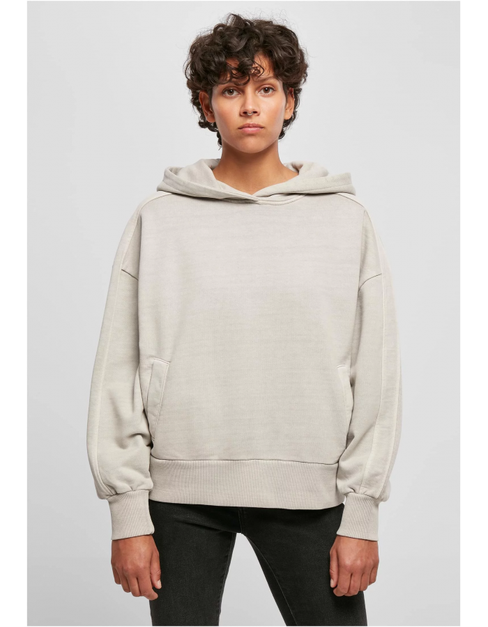 Tato svěží dámská mikina s kapucí představuje trendy styl, který se skládá z lehce běleného prádla a sofistikovaných detailů. Vsadky vedou přes ramena a vnější rukávy i centrálně přes kapuci. Mikina má dvě praktické boční kapsy a široké žebrované manžety na rukávech a lemu. Pohodlný oversize střih se spadlými rameny a těžká a hladká froté bavlna poskytují optimální pohodlí při nošení.