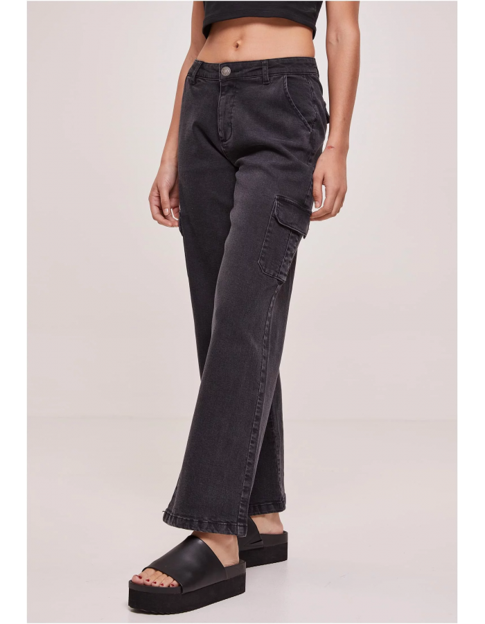 Dámské cargo kalhoty s vysokým pasem, rovnými nohavicemi a cargo kapsami nabízejí pragmatický styl. Jejich pas má knoflík a poutka na pásek a je doplněn dvěma kapsami po stranách. Styl završují dvě klopové kapsy na hýždích. Příjemný volný střih a mírně elastický materiál ze strečového denimu slibují pohodlí při nošení.