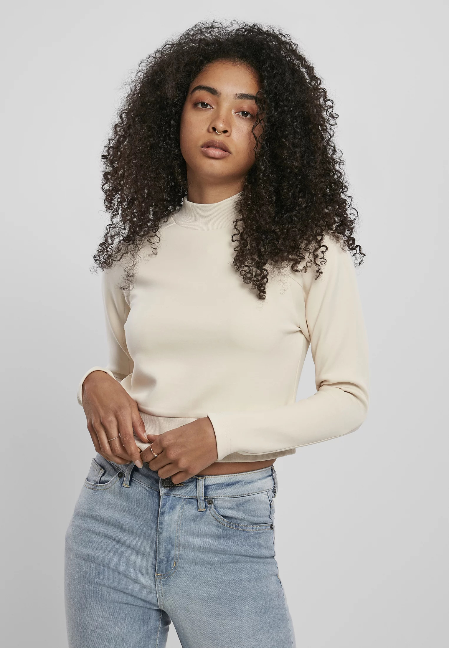 Moderní a elegantní dámský svetr pro fashionisty. Střih je krátký, ale nabízí velkou a dominantní šířku s velkou volností pohybu kolem ramen díky raglánovému tvaru. Stojáček je vyroben z žebrované tkaniny. Široký, zdůrazněný lem dodává mikině styl, zatímco interlockový materiál poskytuje jistý postoj. Střih je pravidelný. Sportovní a elegantní zugleich.