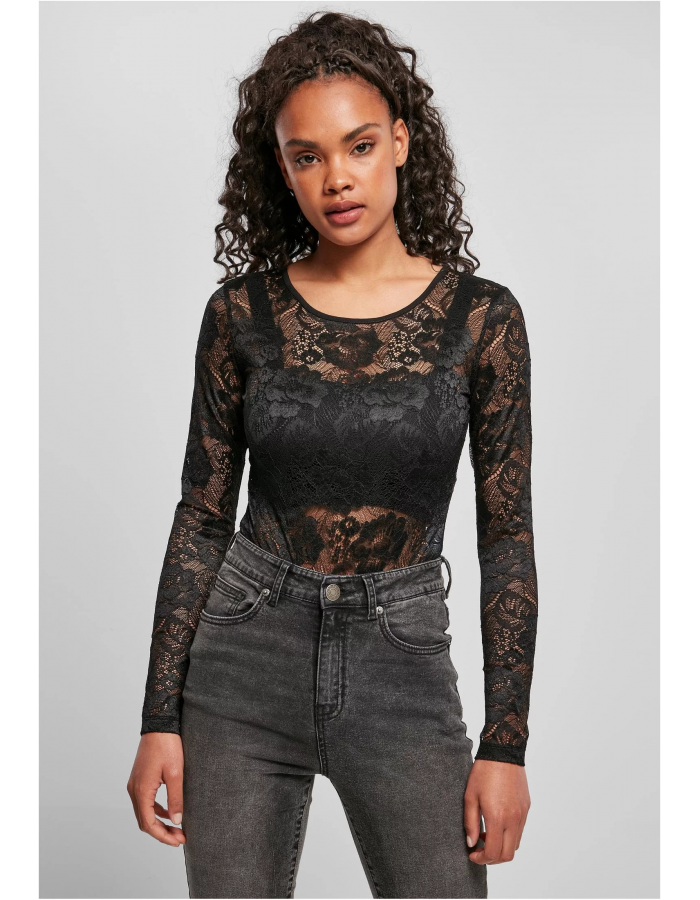 Díky použitému průhlednému a pohodlnému strečovému materiálu toto krajkové tělo umožňuje svůdné pohledy a také padne jako druhá kůže. Dva knoflíky se třemi druky v rozkroku usnadňují oblékání a svlékání. Kromě toho má elegantní tělo dlouhé rukávy a široký, komplikovaně lemovaný výstřih.
