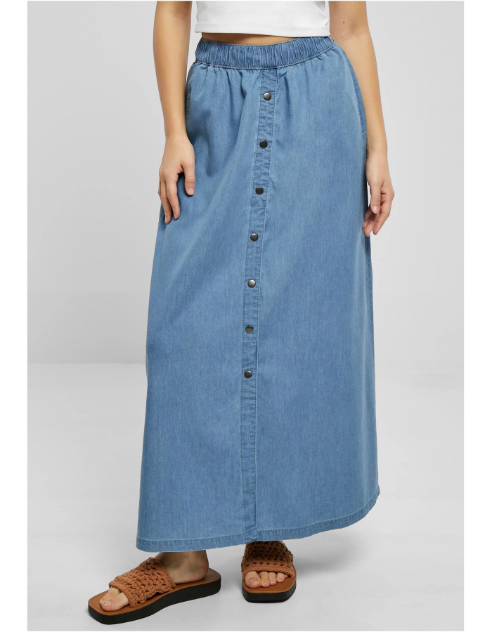 Tato výrazná džínová sukně má uprostřed knoflíkový pásek s kovovými druky. Mimochodem, proužek knoflíků není nutný pro oblékání, protože sukně nabízí také elastický pas, který se podle potřeby natáhne. Sukně je volného střihu, který končí nad kotníky a je vybavena také dvěma bočními kapsami. Použitý materiál je světlá denim bavlna.