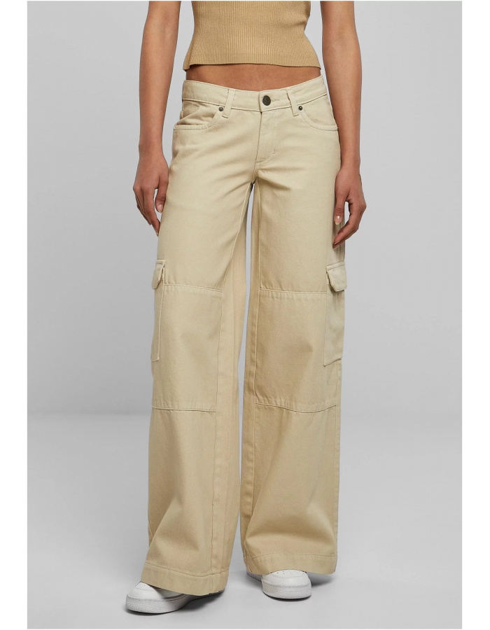 Dámské cargo kalhoty jsou vyrobeny z robustní bavlněné džínoviny. Mají široké a rovné nohavice s cargo kapsami a vstupy na kolenou. Boční kapsy a našité zadní kapsy doplňují obrys. Dámské cargo kalhoty jsou nízkého střihu a pohodlně sedí na bocích. Jsou volného střihu.