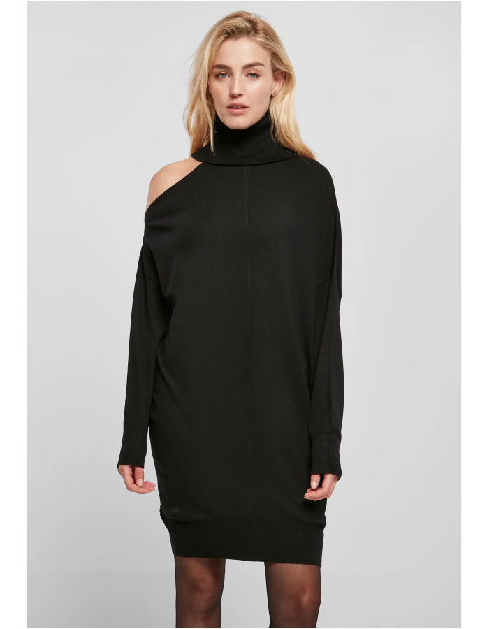 Pletené šaty s rolákem na zimu nesmíte mít. Ramenní výstřih dodává sofistikovaný vzhled. Díky volnému střihu jsou to útulné a stylové šaty zároveň. V kombinaci s pěknými botami a šperky je to vítězná kombinace.