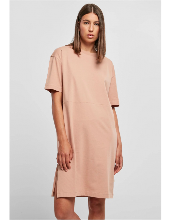 Tyto krásné dámské šaty ve stylu trička, vybavené dlouhými rozparky na obou stranách, upoutají pozornost. Rukávy jsou široké, šikmé a sahají téměř k loktům. Střih je ke kolenům, výstřih je kulatý. Dělící šev v pase zajišťuje dokonalý tvar a ladí s celkovým oversize střihem. Smyslné dámské šaty jsou vyrobeny z organické bavlny a jsou opatřeny štítkem s vlajkou na boku a doprovodným ekologickým štítkem.