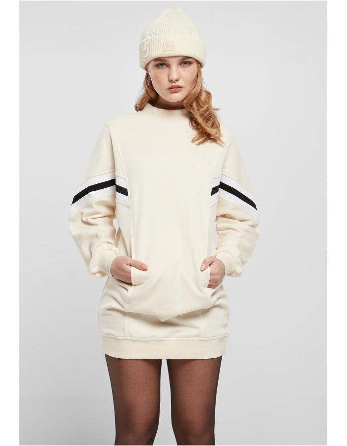 Tyto minišaty jsou naplněny sportovní atmosférou. Diagonálně záplatované pásky na horní části paží a na bocích vycházejí ze slavného školního stylu. Dva boční dělící švy na přední a zadní straně dodávají tvaru oversize střihu. Styl završují široké žebrované manžety na rukávech a lemu a malý žebrovaný stojáček. Dámské školní šaty jsou vyrobeny z bavlny a polyesteru.