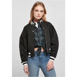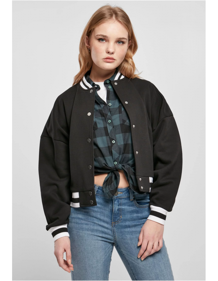 Dámská vysokoškolská bunda plně využívá svůj potenciál prostřednictvím krátkého oversize střihu. Límec, manžety a lem mají žebrovaný vysokoškolský pruhovaný design. Bunda se zapíná na patentní knoflík, boční kapsy ji skvěle doplňují. Je vyrobena z měkkého potu z bavlny a polyesteru.