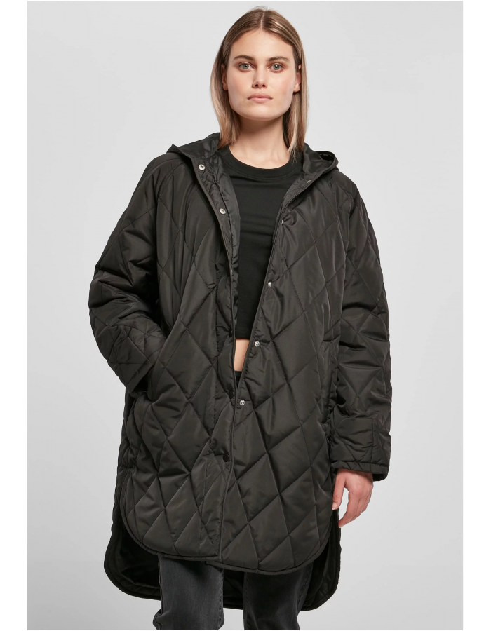 Dámský oversized diamantový prošívaný kabát s kapucí černý M