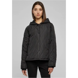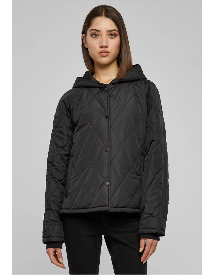 Lehká dámská bunda se prezentuje chladným a vkusným způsobem. Jemné diamantové prošívání doplňuje jeho sportovní střih, který zahrnuje velkou kapuci, zapínání na knoflíky a raglánové rukávy. Dále je dámská bunda vybavena bočními kapsami na zip a žebrovanými manžetami. Střih je pohodlného oversized střihu. Bunda je vyrobena z polyesteru a je podšitá taftem.
