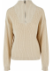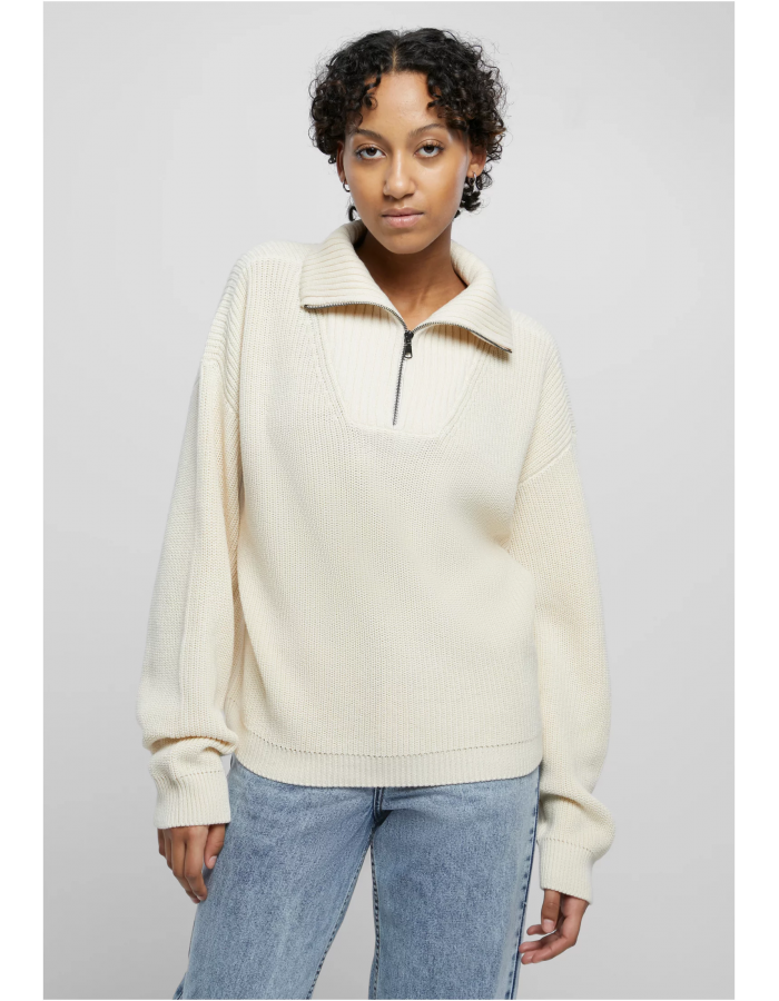Tento dámský svetr je propracovaným střihem. Nabízí klopu na zip – límec tak lze nosit otevřený nebo jako rolák. Také klopa, stejně jako široké manžety na lemu a rukávech, má komplikovaný úplet se střídajícími se vzory. Dámský pletený svetr je díky svému trendovému oversize střihu se spadlými rameny obzvláště módní. Materiálová směs bavlny a akrylu završuje design.