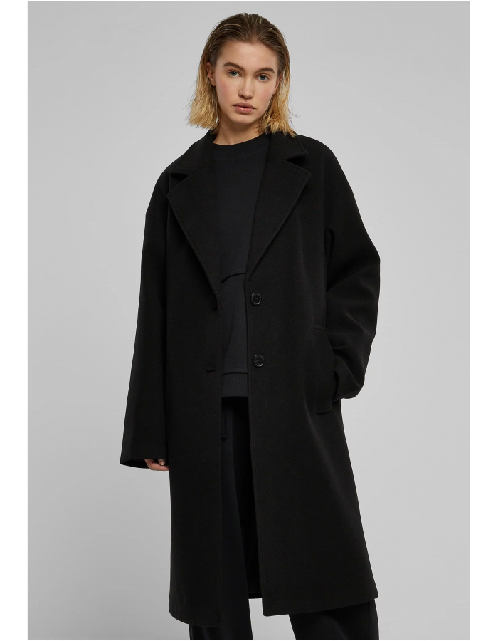 Tento jemný dámský kabát ke kolenům je reinterpretací dámské klasiky – s širokým klopovým límcem a dvěma knoflíky připomínajícími rohovinu. Ležérní oversize střih se spadlými rameny harmonicky doplňuje vzhled. Dále je kabát vybaven postranními kapsami a je vyroben z polyesteru a obsahuje příjemnou taftovou podšívku.