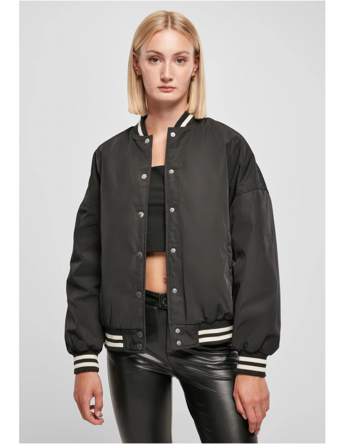 Dámská vysokoškolská bunda je vyrobena v tradičním stylu a je umocněna zvoleným oversize střihem s prodlouženými rameny a ekologicky nezávadnou látkou. Bunda je lehce polstrovaná, je vybavena légou na knoflík a dvěma bočními kapsami na zip. Stojáček a jeho široké žebrované manžety na rukávech a lemu mají zavedený vysokoškolský pruhovaný vzor.