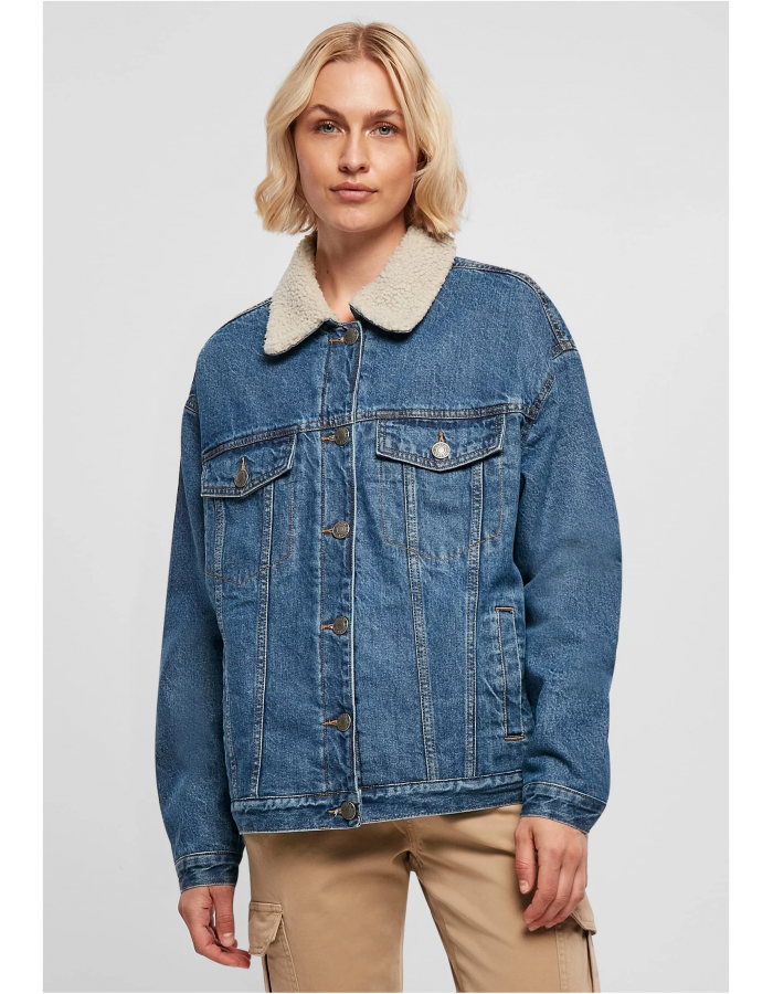 Džínová bunda pro ženy je vyrobena v klasickém oversized formátu a s límcem Sherpa a příjemnou podšívkou Sherpa. Typické prvky džínové bundy – knoflíková léga, náprsní kapsy s klopami kapes, boční kapsy i knoflíky a poutka na lemu – harmonicky definují vzhled. Dámská džínová bunda je vyrobena z bavlny a polyesteru.