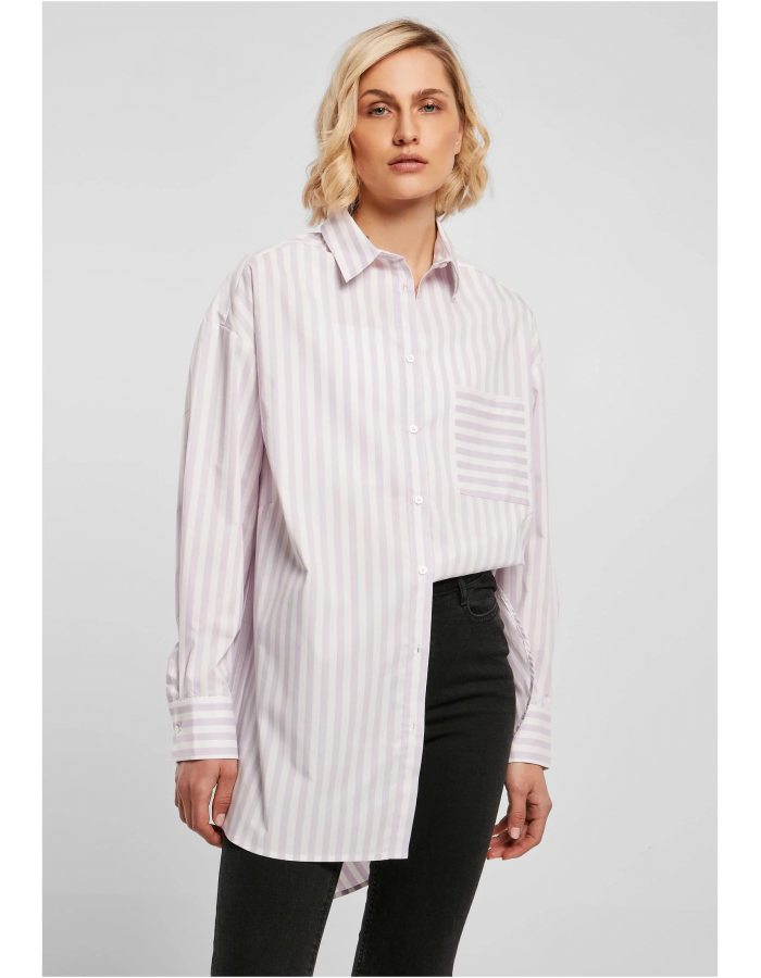 Tato široká a dlouhá dámská košile s vertikálními pruhy, nadměrnými rameny a zaoblenými lemy je stylovým a výrazným módním společníkem. Zadní díl topu je výrazně delšího střihu a na bocích jsou rozparky. Ležérní styl košile je doplněn typickými znaky – límečkem, knoflíkovou légou a náprsní kapsou – rukávy jsou důmyslně opatřeny manžetami. Dámský top je oversized střihu a skládá se z příjemné směsi bavlny a popelínu.