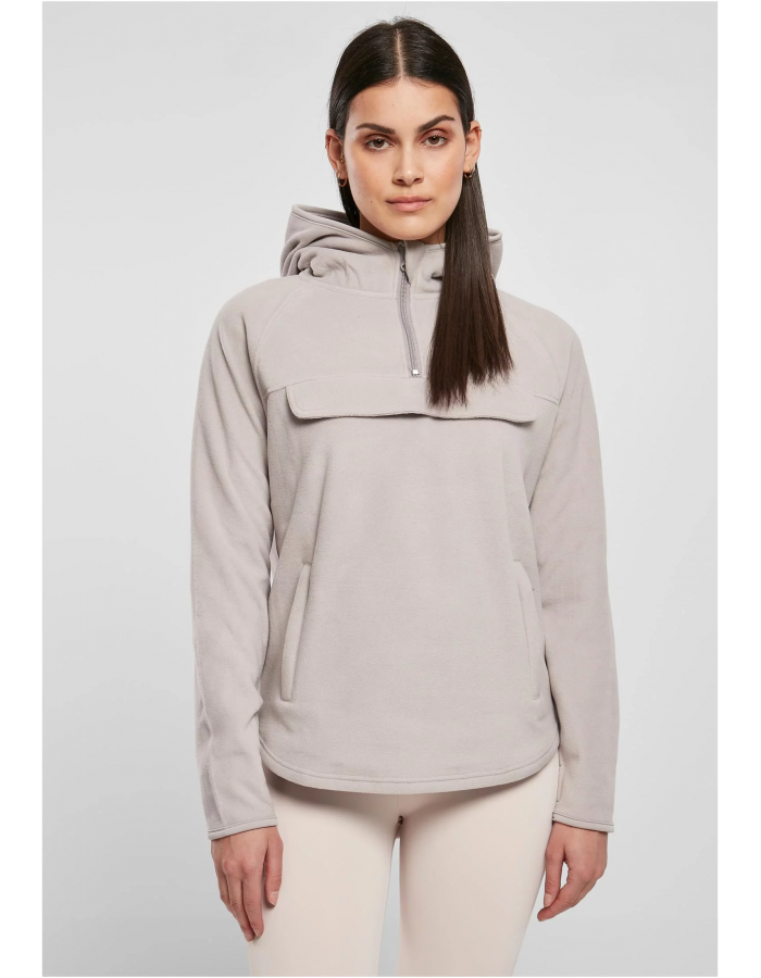 Tato dámská mikina s kapucí je hybridem mikiny s kapucí a stahovací bundy. Kapuce má zip na klopě a chránič brady. Zespodu se přes hrudník táhne jednoduchá chlopeň. Dále je svetr vybaven dlouhými rukávy a dvěma bočními kapsami na zip. Přední a zadní část nabízí velkoryse zaoblené spodní lemy, přičemž zadní část spadá přes spodní část, aby byla v teple. Střih s raglánovými rukávy a použitím hladkého mikrofleece materiálu je zajištěn optimální komfort nošení. Úzká páska na manžetách rukávů a kapuci doplňuje styl. Dámská mikina s kapucí je regular fit.