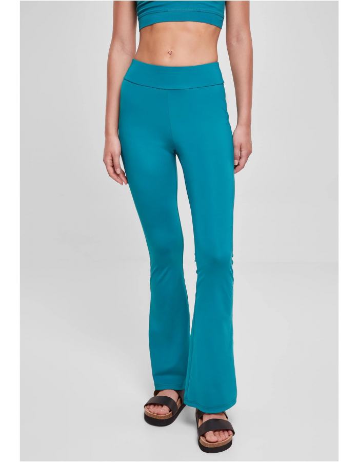 Ležérní a módní městský kousek: dámské legíny sedí těsně ke kolenům a odtud se rozšiřují s elegantním rozevřením. Vybavena vysokým elastickým pasem a vyrobena z hladkého materiálu z recyklovaného polyesteru a elastanu, je zajištěno ideální pohodlí při nošení.