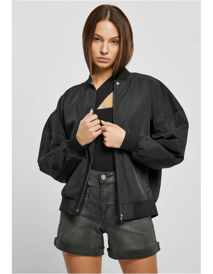 Nonšalantní dámská bunda typu bomber je vyrobena mimo jiné z nádherně lehkého recyklovaného polyesteru a je radost ji nosit. Střih je oversized a bunda se zapíná na tónovaný plastový zip, který je důmyslně skryt překrytím. Módní dámská bunda, doplněná taftovou podšívkou, žebrovaným límcem, žebrovanými rukávy, žebrovaným pasem, širokými spadlými rameny a dvěma kapsami, má vše, co člověk potřebuje.
