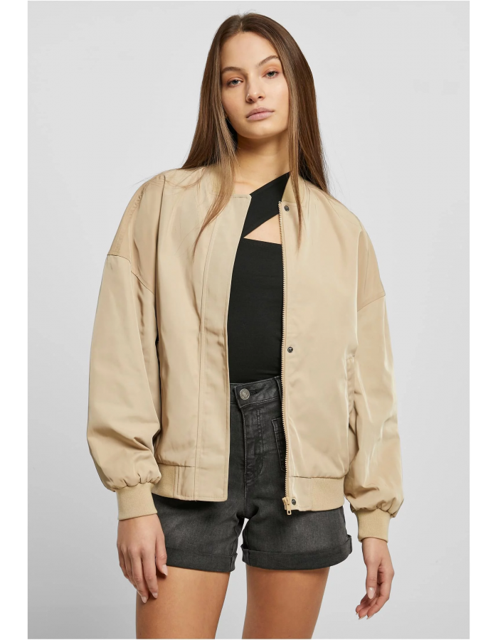 Nonšalantní dámská bunda typu bomber je vyrobena mimo jiné z nádherně lehkého recyklovaného polyesteru a je radost ji nosit. Střih je oversized a bunda se zapíná na tónovaný plastový zip, který je důmyslně skryt překrytím. Módní dámská bunda, doplněná taftovou podšívkou, žebrovaným límcem, žebrovanými rukávy, žebrovaným pasem, širokými spadlými rameny a dvěma kapsami, má vše, co člověk potřebuje.