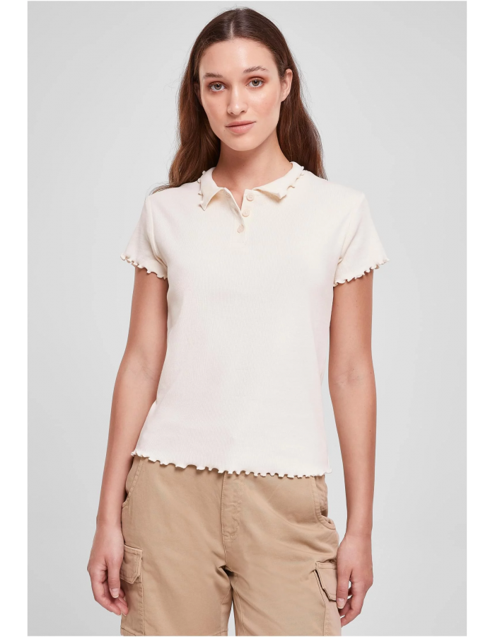 Tento roztomilý dámský top nabízí nařasený vzhled polo límečku, lemu a rukávů. Krátká knoflíková léga doplňuje polo límeček, zatímco střih je uvolněného úzkého střihu. Použitý materiál je čistá bavlna, napuštěná malým množstvím elastanu.
