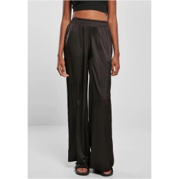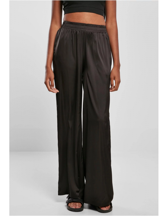 Hladký, třpytivý satén a rovný, široký střih dodávají těmto dámským kalhotám styl a nebeský komfort. Díky zvolenému volnému střihu padají nohy široce a rovně dolů a sbírají se do mírných záhybů. Pas je opatřen gumičkou. Vzhled dotvářejí boční kapsy.
