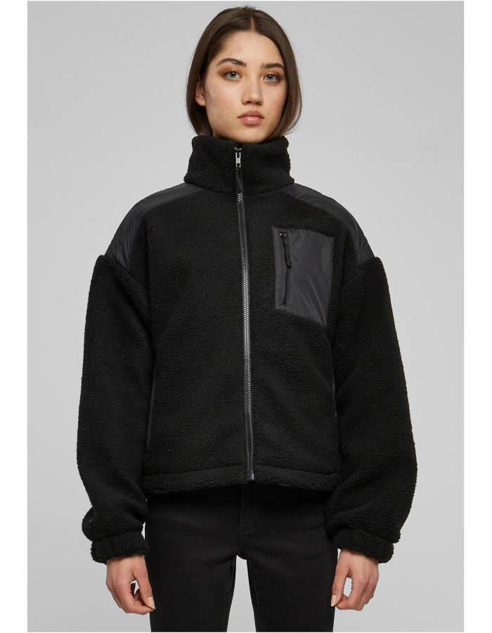 Lehká dámská bunda z nadýchané látky Sherpa dodává výrazné akcenty díky hladkým nylonovým vsadkám na ramenou a náprsní kapse. Má vysoký stojáček a zapíná se na zip. Další praktické detaily jsou boční kapsy, náprsní kapsa je navíc opatřena svislým zipem. Bunda Sherpa je oversize střihu s mírně spadlými rameny. Dá se upravit pomocí elastické šňůrky se zátkou na lemu. Elastické manžety rukávů poskytují dodatečnou podporu. Dámská bunda je podšitá síťovinou.