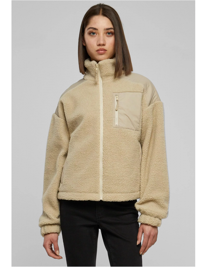 Lehká dámská bunda z nadýchané látky Sherpa dodává výrazné akcenty díky hladkým nylonovým vsadkám na ramenou a náprsní kapse. Má vysoký stojáček a zapíná se na zip. Další praktické detaily jsou boční kapsy, náprsní kapsa je navíc opatřena svislým zipem. Bunda Sherpa je oversize střihu s mírně spadlými rameny. Dá se upravit pomocí elastické šňůrky se zátkou na lemu. Elastické manžety rukávů poskytují dodatečnou podporu. Dámská bunda je podšitá síťovinou.