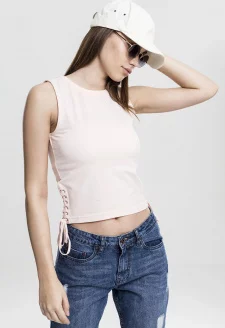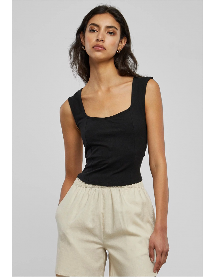 Dámský živůtek slim fit top má na přední straně tři dělící švy, takže připomíná klasickou živůtku. Lem je zaoblený a zužuje se do špičky, zatímco výstřih je podlouhlého tvaru. Široká ramínka košile pohodlně sedí na ramenou.
