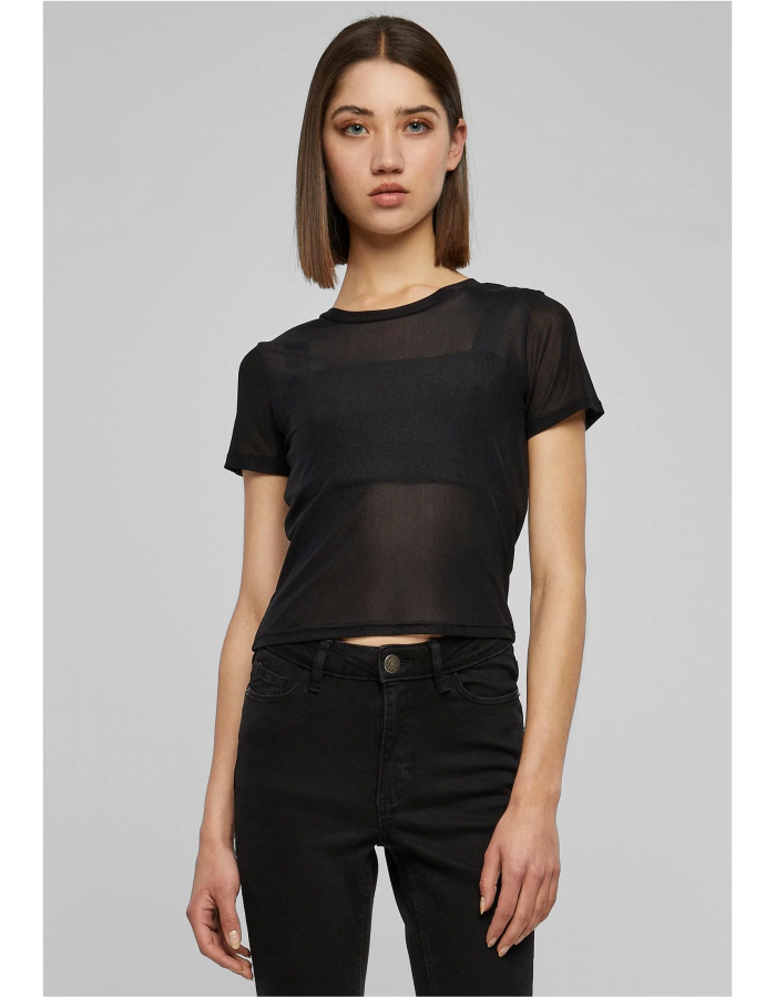 Dámské tričko má přiléhavý, zkrácený střih a pohodlný slim střih. Použitý materiál, vyrobený z polyamidu a elastanu, je mírně průhledný. Design doplňuje lemovaný výstřih a krátké rukávy.