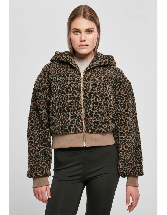 Tato odvážná dámská bunda je správným módním vrcholem a vyznačuje se krátkým, ale oversized střihem a velkou kapucí. Jeho nadýchaný materiál Sherpa a celoplošný vzor jsou bokovými detaily. Dále je bunda vybavena bočními kapsami a zapíná se na kovový zip. Dalšími detaily jsou široké, kontrastní žebrované manžety na rukávech a lemu, stejně jako taftová podšívka na vnitřní straně, která poskytuje další pohodlí při nošení.