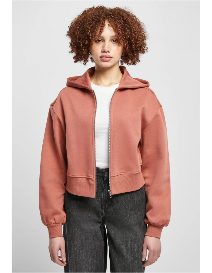 Tato pohodlná dámská bunda kombinuje výhody mikiny s kapucí a vesty. Nabízí velkorysou kapuci, kovový zip a dvě boční kapsy na zip. Střih dámské bundy je oversized a přitom krátký. Spadlé rukávy vybavené žebrovanými manžetami poskytují dodatečné pohodlí při nošení. Ležérní bunda na zip je vyrobena z hladkého česaného fleecu.