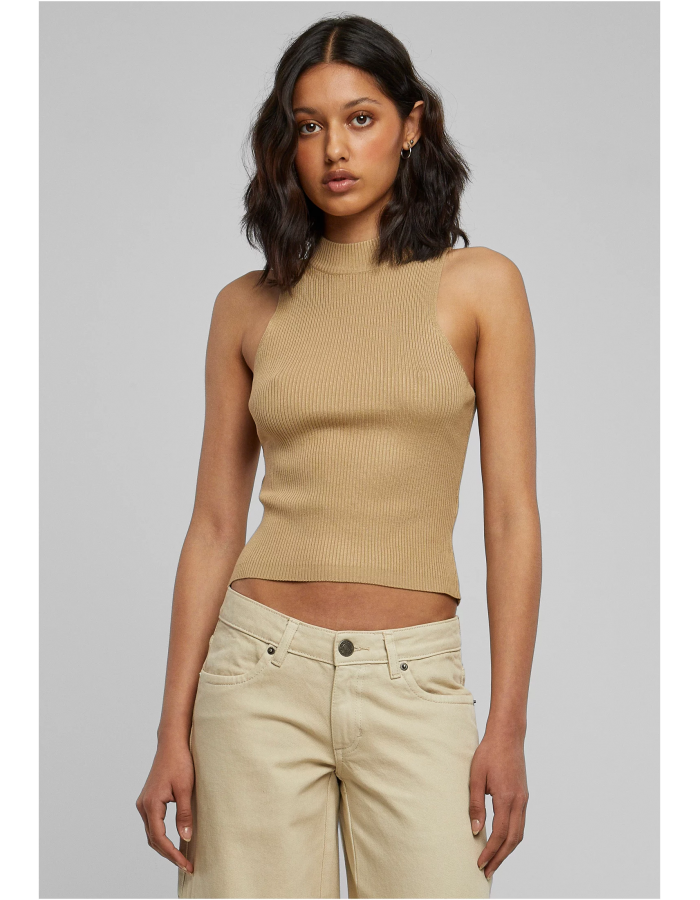 Tento elegantní dámský úpletový top se prezentuje jako decentní klasika v nadčasovém tvaru. Je bez rukávů, má jemný rolák a má krátkou délku těsně pod boky. Slim fit střih také vytváří skvělou siluetu. Top je vyroben z jemné žebrované tkaniny (polyakryl, viskóza a nylon) a je bez manžety.