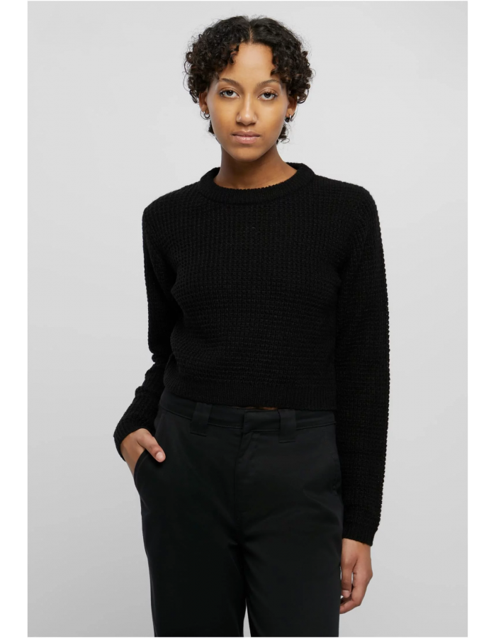 Dámský svetr se prezentuje úhledným vzorem vaflového úpletu. Je doplněna odpovídajícím designem posádky krku, lemu a manžety rukávů. Dámský svetr má krátkou, téměř zkrácenou délku a má pravidelný střih. Zvoleným materiálem je hladký akryl.