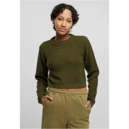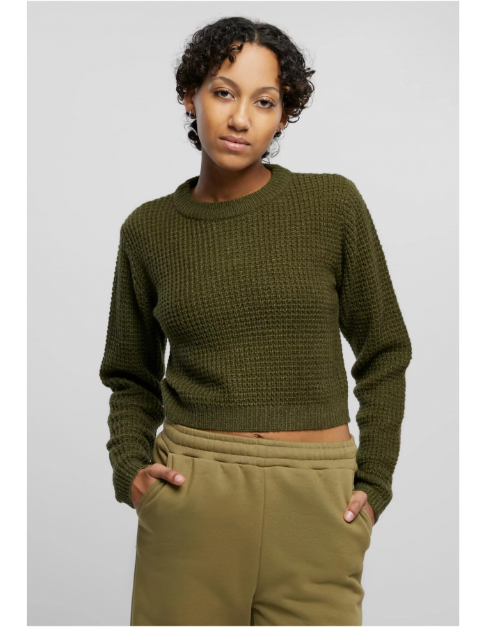 Dámský svetr se prezentuje úhledným vzorem vaflového úpletu. Je doplněna odpovídajícím designem posádky krku, lemu a manžety rukávů. Dámský svetr má krátkou, téměř zkrácenou délku a má pravidelný střih. Zvoleným materiálem je hladký akryl.