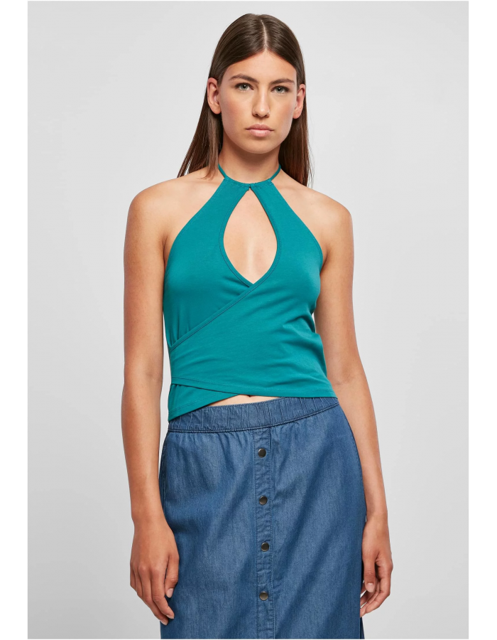 Dámský zavinovací top s nákrčníkem je vhodným kouskem oblečení pro každou ženu, která hledá elegantní a sexy outfit. Její hluboký výstřih vytváří dramatický efekt, který umocňuje široká holá záda. Celkový efekt jako celek udává neodolatelný tón. Top využívá úzký krátký střih, který přilne k tělu.