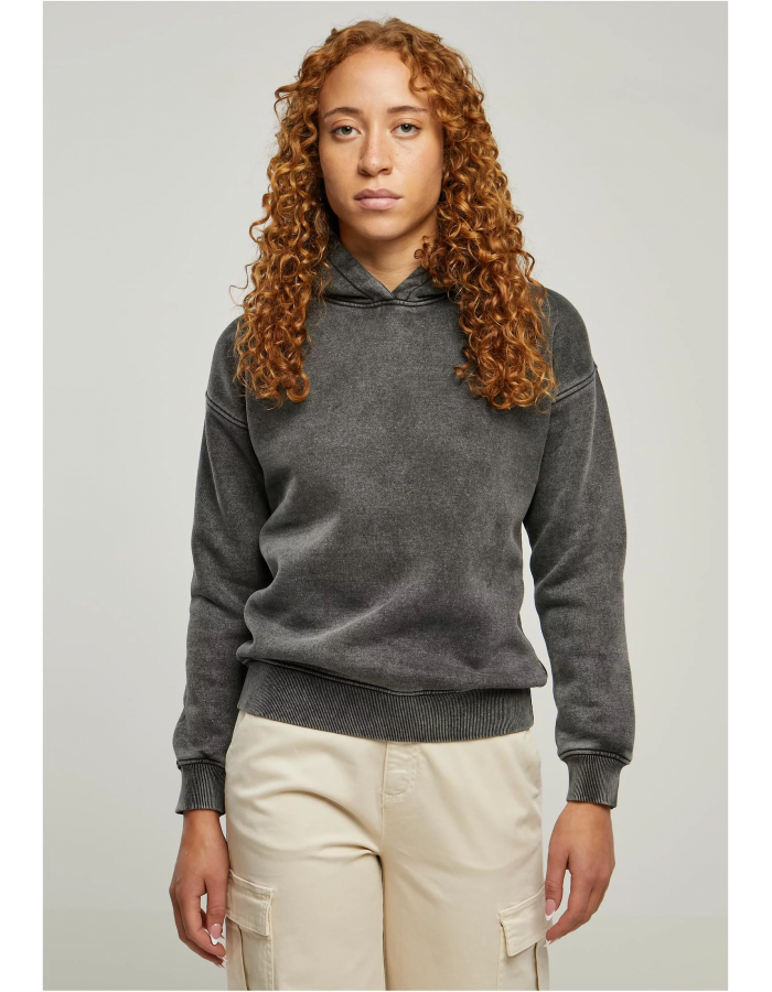 Ležérní a ženská dámská mikina s kapucí se vším potřebným – útulná kapuce a široké manžety na rukávech a spodním lemu. Použité kamenné praní vytváří jemné akcenty v jinak monochromatickém materiálu, zatímco volný střih se spadlými rameny doplňuje vzhled. Dámská mikina s kapucí je vyrobena z vydařeného materiálového mixu bavlny a polyesteru.
