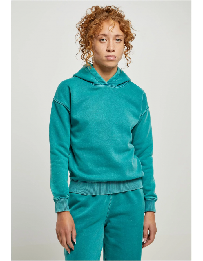 Ležérní a ženská dámská mikina s kapucí se vším potřebným – útulná kapuce a široké manžety na rukávech a spodním lemu. Použité kamenné praní vytváří jemné akcenty v jinak monochromatickém materiálu, zatímco volný střih se spadlými rameny doplňuje vzhled. Dámská mikina s kapucí je vyrobena z vydařeného materiálového mixu bavlny a polyesteru.