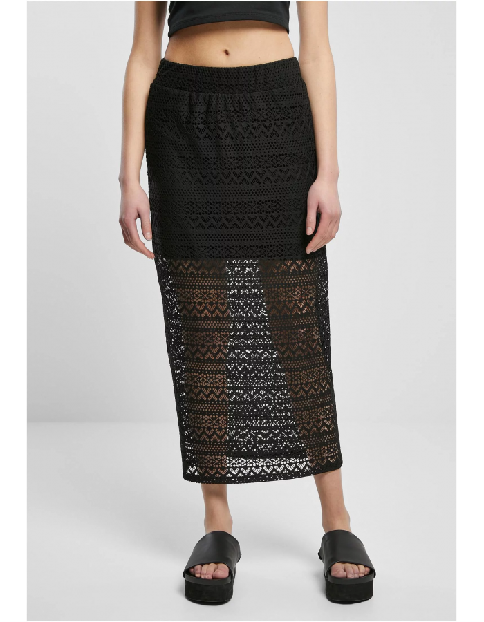 Sukně po kotníky okouzlí filigránovým, průhledným krajkovým vzorem a jednoduchým rovným střihem. Neprůhledný Stretch dres přebírá nad koleny. Sukně využívá elastický pas pro optimální přizpůsobení. Je vyrobena z elastické krajky.