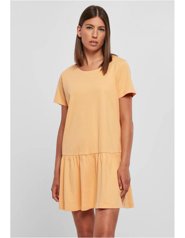 Široký střih a jednoduchý, ale efektní design tohoto dámského trička vypadá úžasně žensky. Krátké rukávy, volný střih i hluboký kulatý výstřih připomínají tvarem vyhlášeného trička. Volantový přístup sukně vytváří jemný akcent. Stejně snadný jako střih je materiál dámských šatů, který se skládá z hladkého single jersey.
